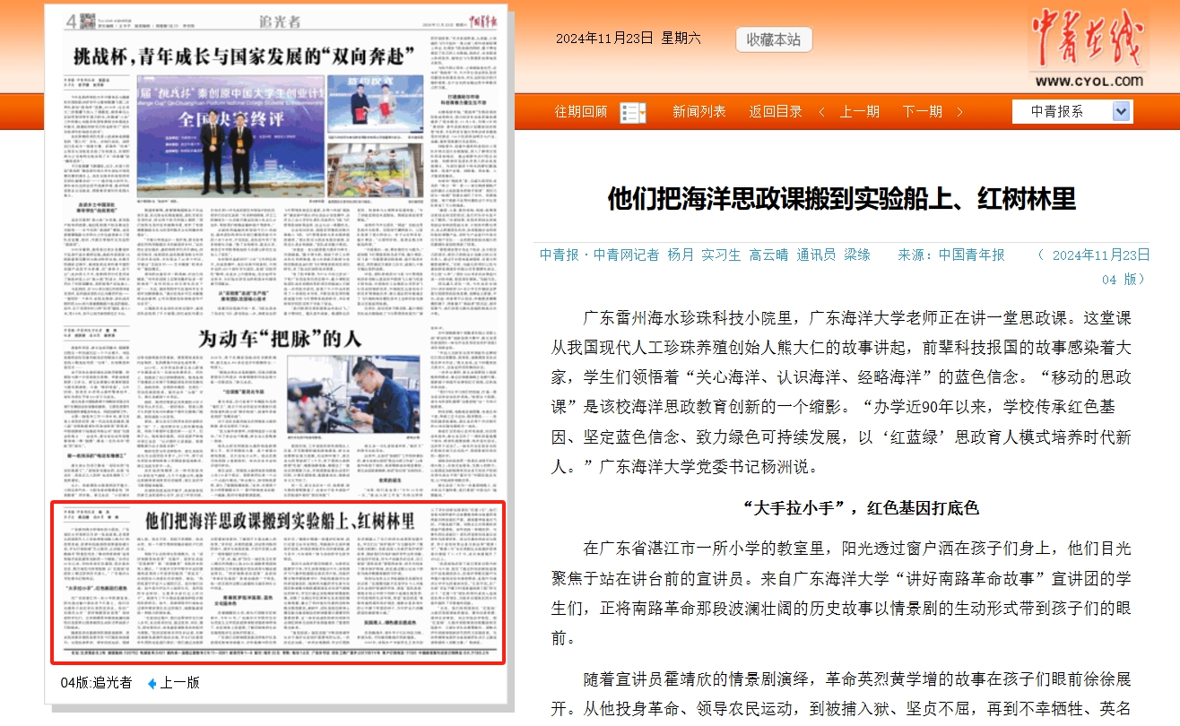 11月23日,《中国青年报》(共青团中央机关报)第4版以《他们把海洋思政课搬到实验船上、红树林里》为题,深度报道了我校深化‘红蓝绿’大海洋思政课体系建设,整合优质资源,善用社会课堂,创新思政教育实践,培育时代新人的工作经验,中国青年报客户端、中国青年网、中青在线等转载了该报道,并获中国青年报客户端首页推荐。