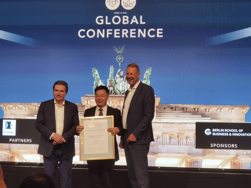 在AMBA&BGA 2025全球年会上,杨洲代表学校领取了BGA国际商学院金牌认证证书,并与BGA协会负责人及来自全球商学院的与会代表就我校相关学科发展进行深入交流。本次AMBA&BGA全球年会吸引了来自全球百余所高水平商学院的460位代表参会。在大会“中国商学院特色专场”环节,我校管理学院院长杜军介绍了我校“经济管理与涉海学科”交叉融合、“管理学科与人工智能”交叉融合的鲜明办学特色,强调了管理学院“持续打造成为一所负责任、有担当、全球具有海洋经济管理特色的高水平现代化管理学院”的愿景和使命。