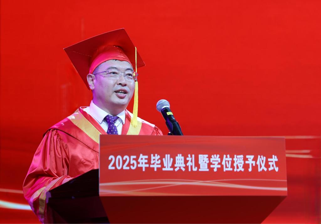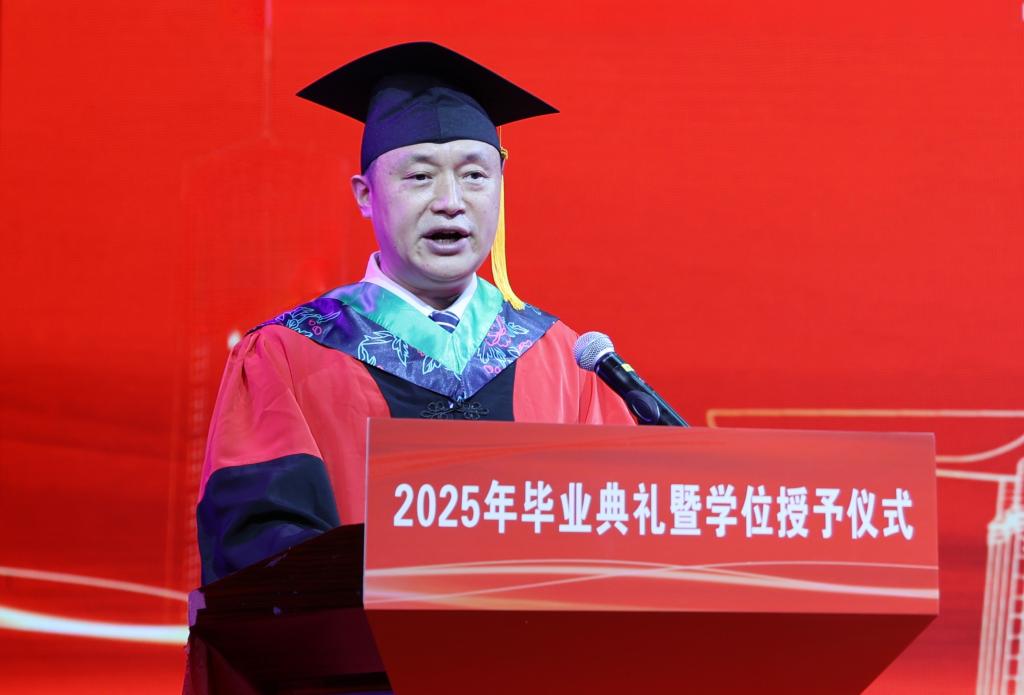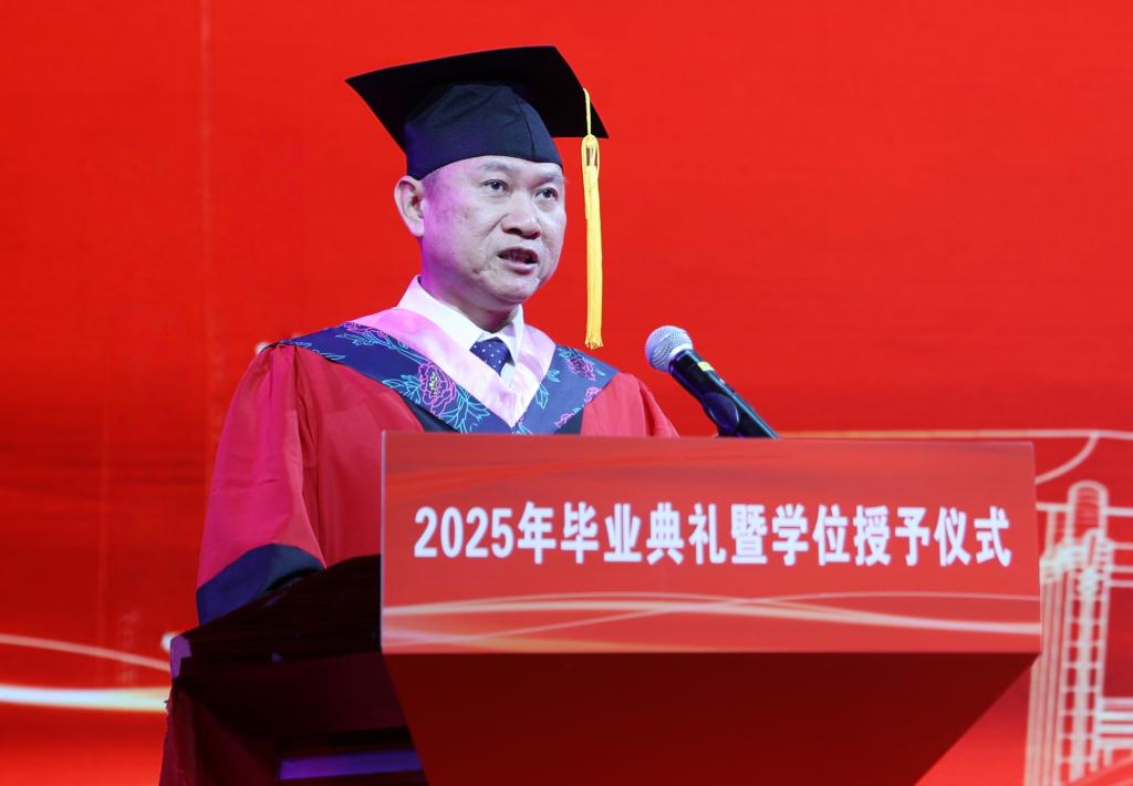 “做一个主动成长的人!”学校党委书记杨洲为全体毕业生送上温暖且充满力量的毕业赠言。他以Deepseek、宇树机器人等新兴科技企业的崛起和优秀青年的成长经历为例,分享了对于“主动成长”的思考。他深入阐述了“主动成长”的内涵,指出其为一种基于自我驱动、有意识追求进步的发展模式和一种积极的生命态度和生活方式;并从“责任与担当的淬炼”“恒心与韧性的锻造”“幸福与快乐的绽放”等三个方面寄语毕业生要以青春应有的姿态主动成长,探寻人生最美的风景。