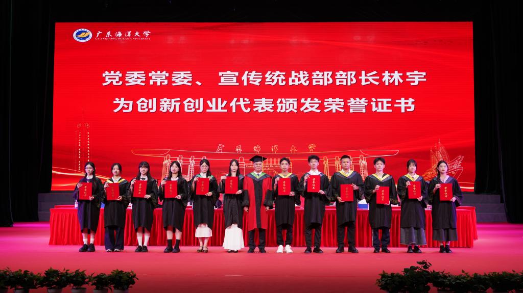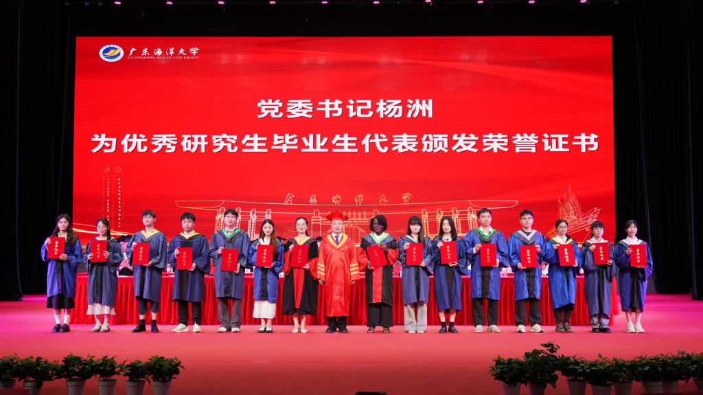 研究生毕业生代表、水产学院水产专业张志强同学感恩海大为学子提供了探索深蓝的广阔平台和孕育蓝色梦想的沃土,表示将用青春的智慧、坚韧的意志和沸腾的热血,在民族复兴的壮阔航程中,奋力书写属于新一代青年的壮丽篇章。
