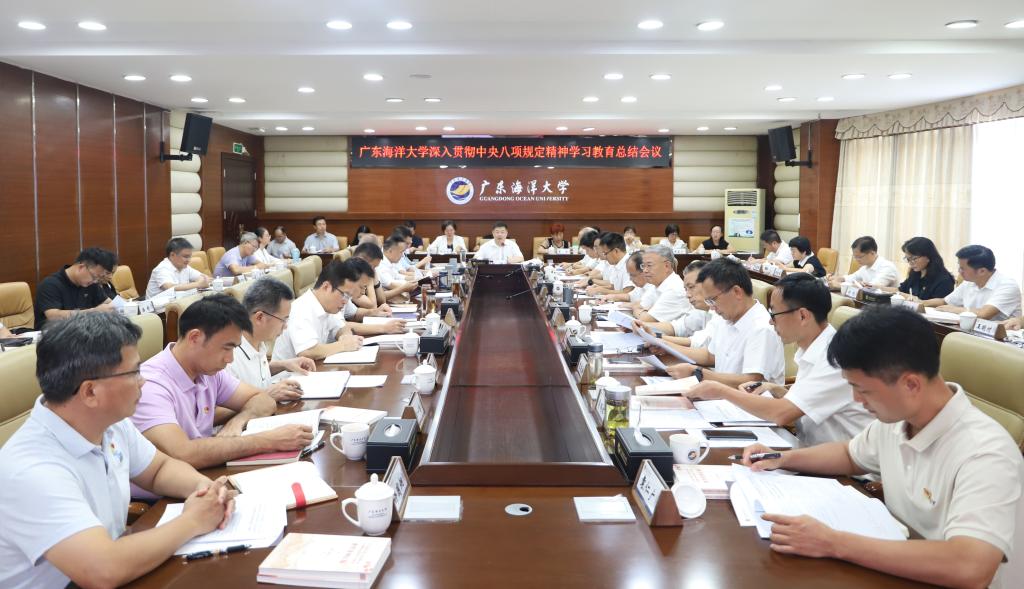 9月15日下午,广东海洋大学在湖光校区行政楼五楼会议室召开深入贯彻中央八项规定精神学习教育总结会议,传达学习习近平总书记关于深入贯彻中央八项规定精神学习教育的重要指示精神和中央、省委党的建设工作领导小组会议精神,全面总结学校学习教育开展情况,对巩固拓展学习教育成果、锲而不舍落实中央八项规定精神、推进作风建设常态化长效化等作出安排部署。