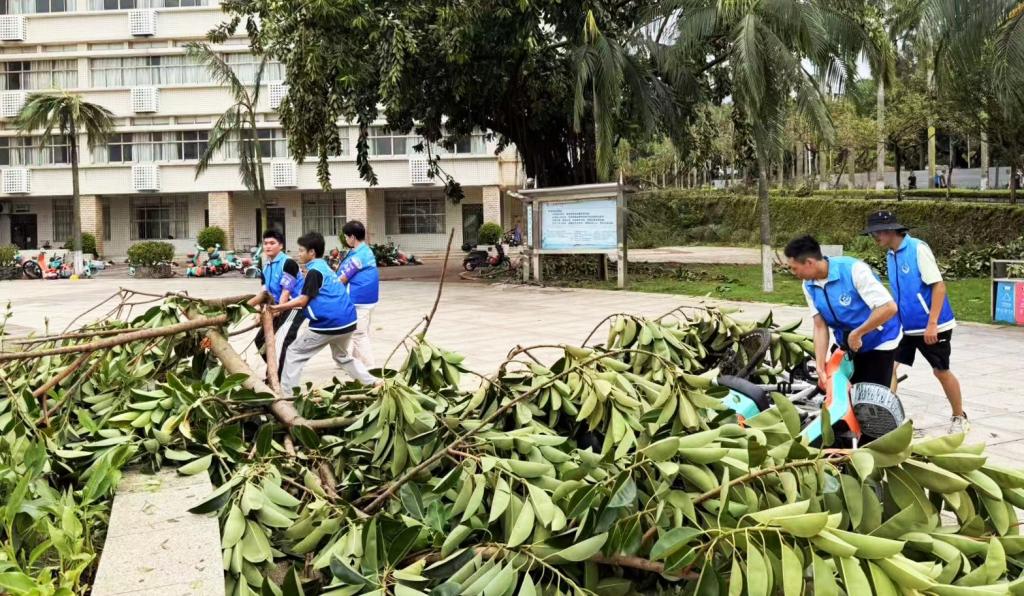 灾情就是命令,旗帜彰显担当。台风过后,学校党委第一时间发出号召,机关党委等各基层党组织闻令而动,迅速组建起一支支由党员干部、党员教师和学生党员组成的“党员突击队”“党员先锋队”。他们手持锯子、铁锹等工具,冲锋在灾后重建第一线:在主干道上,他们协力将倒伏的大树切割、搬离,清理交通障碍。在校园公共区域内,他们积极参与积水排放、淤泥清扫、残枝败叶清理,以及受损设施的初步修复工作,争分夺秒恢复校园正常秩序。“作为一名党员,这个时候就应该站在最前面,用我们的努力,尽快为师生恢复一个安全、整洁的学习生活环境。”一名参与重建清理工作的党员干部表示。此外,学校50余名党员志愿者还积极响应湛江市灾后恢复号召,深入海头港社区开展志愿服务。他们协助清理社区道路,用实际行动践行初心使命,展现了学校党员服务社会、勇于担当的良好形象。