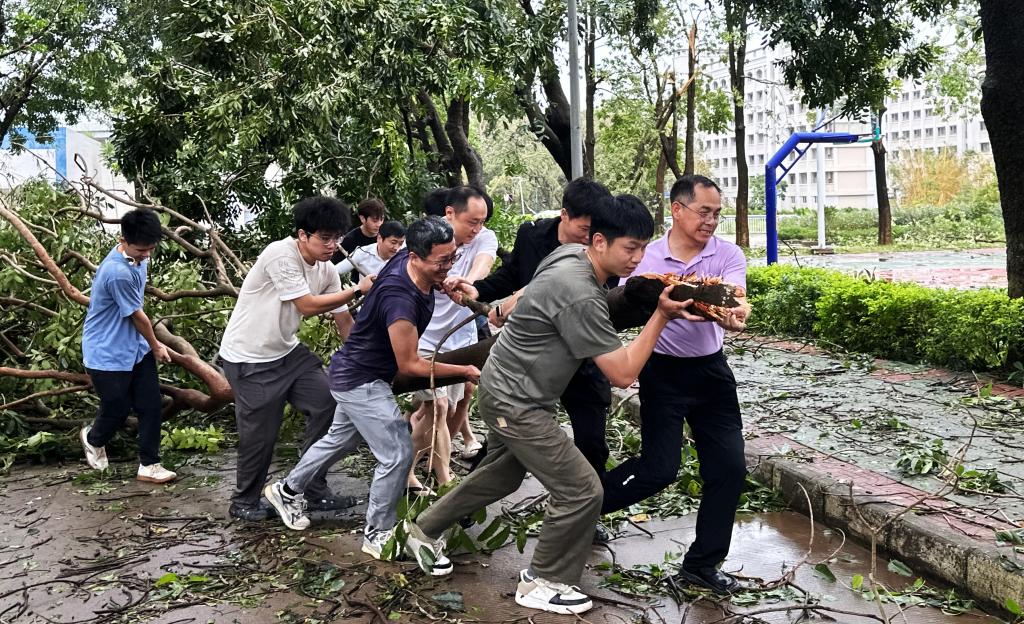 “我们的校园,我们共同守护!”——这不仅是响亮的口号,更是海大师生坚定的行动。大家自发集结投入到校园清理工作中。现场分工有序、配合默契:有人细致捡拾散落的枝叶,有人将断裂的树枝归拢成堆,还有人清扫路面的积水和淤泥。汗水浸透了衣背,泥泞沾满了鞋裤,但每一张脸庞上都写满了坚定与担当,忙碌的身影间传递着众志成城的暖流。“看到昔日美丽的校园受灾,心里特别不是滋味。但能和老师、同学们并肩作战,亲手让校园一点点恢复原貌,再累也值得,心里特别踏实、也特别自豪。”一位正埋头清理的同学感慨道。