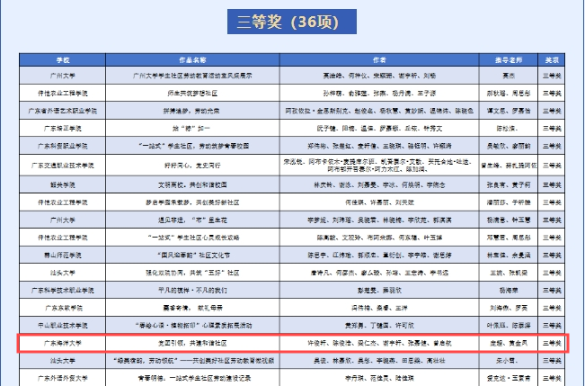 近日,由广东高校网络思想政治工作中心主办的广东高校“一站式”学生社区劳动教育微视频征集评选活动结果揭晓,共评选出一等奖22项、二等奖44项、三等奖66项。我校报送的作品《“一站式”社区让校园生活更美好》《党团引领,共建和谐社区》从全省386份参评作品中脱颖而出,分别荣获“共创社区美好”微视频赛道一等奖和三等奖。