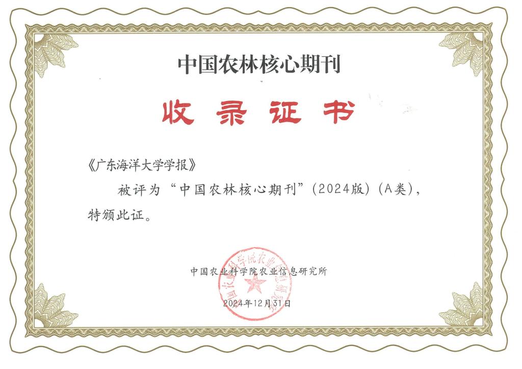 这是我校学报首次跻身农林核心期刊A类,并在水产与渔业类期刊中实现综合评价得分排名显著提升。这是继此前入选B类核心期刊后的又一次突破,标志着我校学报学术影响力迈上新台阶,也是我校学报继获得“北大中文核心期刊”“中国科学引文数据库(CSCD)”“中国科技核心期刊”“中国农业期刊精品期刊”等荣誉称号后的又一重要成绩。
