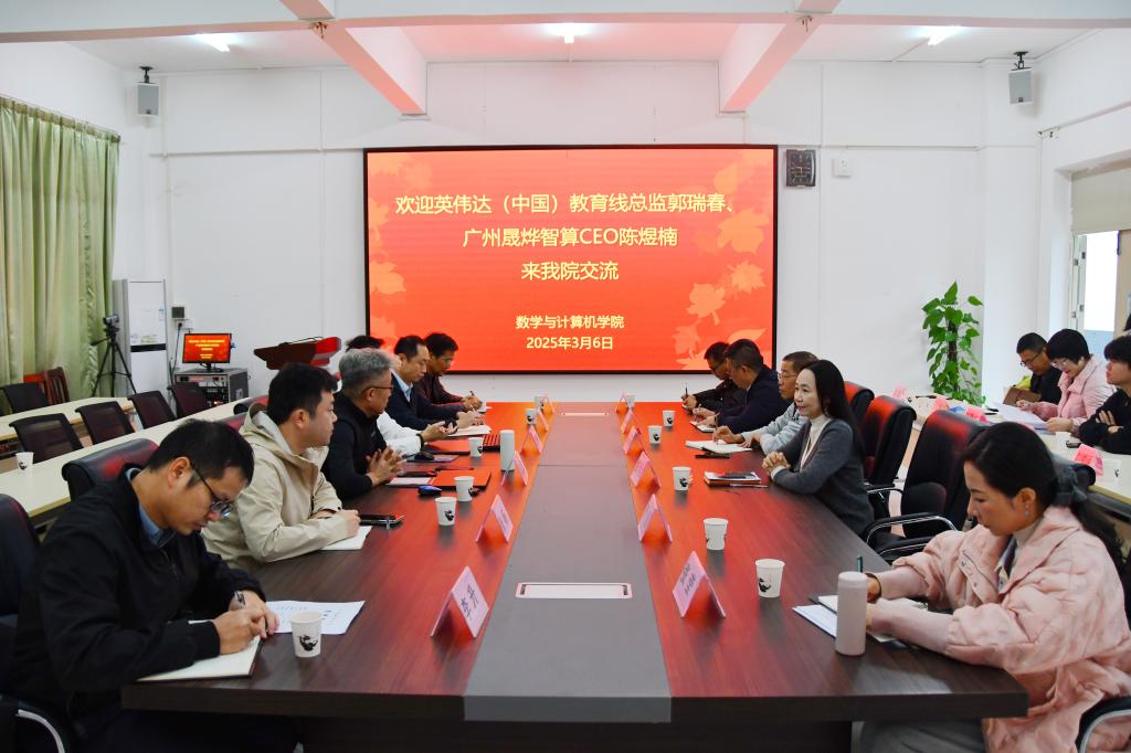 3月6日上午,应数学与计算机学院邀请,英伟达(中国)教育线总监郭瑞春、广州晟烨智算CEO陈煜楠一行来校出席数学与计算机学院人工智能教育教学研讨会。研讨会由数学与计算机学院院长彭小红主持,教务部部长严谨、现代教育技术中心主任张光亚、数学与计算机学院副院长余应淮、各教学系正副主任、计算机公共教学部全体教师参加了研讨会。