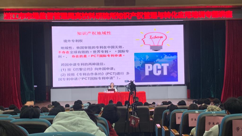 为提升高校知识产权素养、推动科技成果转化寻求新契机,近日,由湛江市市场监管局主办的高校科研院所知识产权管理与转化应用培训专题讲座在我校湖光校区举行。广东省市场监督管理局一级巡视员谢红,湛江市市场监督管理局总工程师叶国琳,学校科学技术部副部长钟赛意、图书馆副馆长张军雄等参加讲座。讲座以视频直播的方式在岭南师范学院、广东医科大学、广东文理职业学院、湛江幼儿师范专科学校和湛江科技学院设置了5个分会场,我校200余名师生代表参加专题讲座。
