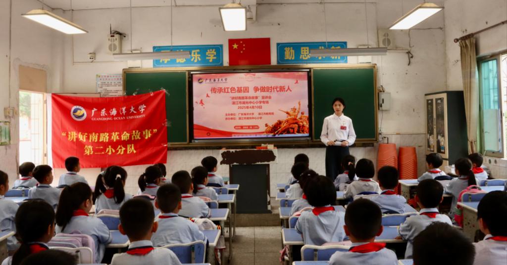 为推动全市大中小学思政教育一体化建设,4月10日,由我校和湛江市教育局联合主办的“讲好南路革命故事”活动近日在全市展开。我校“讲好南路革命故事”宣讲团以“传承红色基因 争做时代新人”为主题,走进湛江市湖光中心小学开展沉浸式宣讲。学校研究生院副院长、宣讲团副总指导教师陈关怡,骨干教员谢米希开买尔·买买提、陈傲蕾,湖光中心小学校长谢海生、党支部书记陈汉发、麻章区教育股股长沈益平带领我校42名宣讲员同学走进36个班级课堂,开启这场跨越百年的红色对话。