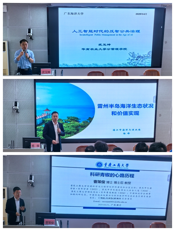 在专题报告环节,论坛邀请了华南农业大学MPA教育中心主任武玉坤、湛江海洋与渔业局副局长杨锋、重庆工商大学管理科学与工程学院教授曹策俊分别作题为《人工智能时代的反智公共治理》《雷州半岛海洋生态的状况和价值实现》《科研青椒的心路历程》的专题报告。