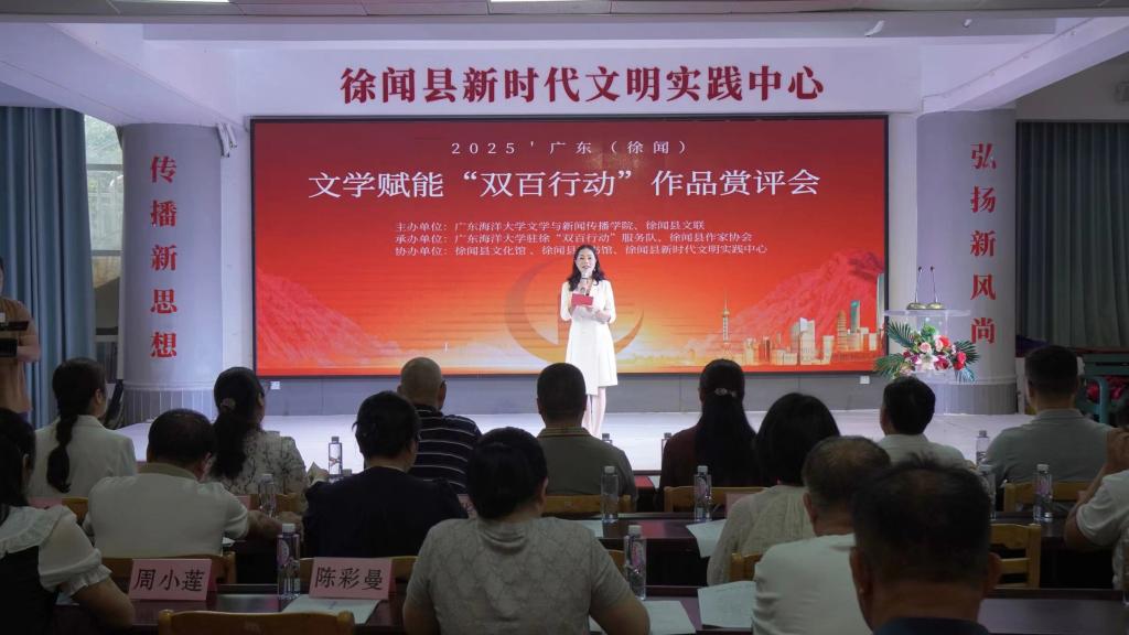 4月19日,文学与新闻传播学院与徐闻县文联联合主办的文学赋能“双百行动”作品赏评会在徐闻县新时代文明实践中心举行。本次活动由我校驻徐闻“双百行动”服务队、徐闻县作家协会承办,徐闻县文化馆、图书馆和新时代文明实践中心协办。文学与新闻传播学院党委书记张艳梅,化学与环境学院党委书记、“双百行动”服务队队长何国明,文学与新闻传播学院党委副书记胡墨、副院长刘刚等,徐闻县文联主席杨飞、作家协会主席李青,以及活动协办单位的领导、县文联属下各协会领导、作品入选作家、县作协会员等县内文化教育界人士参加活动。