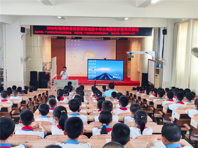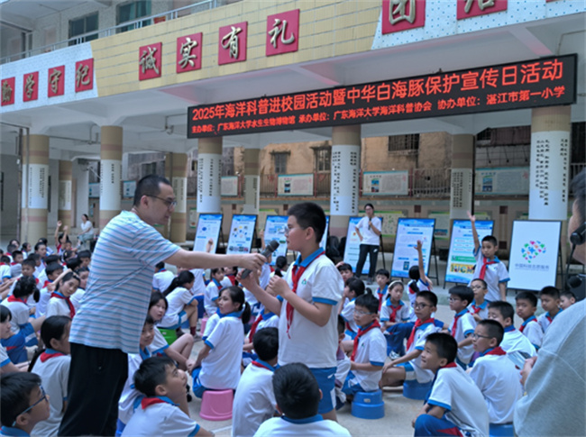 4月23日,我校水生生物博物馆科普团队走进湛江市第一小学,开展“守护海洋精灵,建设美丽中国”中华白海豚保护主题科普活动,为师生们带来了一场生动的中华白海豚保护科普宣传活动。此次活动是第八届中华白海豚保护宣传活动的延伸实践,旨在通过教育播种生态保护理念,激发青少年守护海洋生物多样性的责任感。湛江市第一小学校长张文献出席活动并讲话,呼吁师生争当海洋守护者,共建人与自然和谐共生的美丽家园。