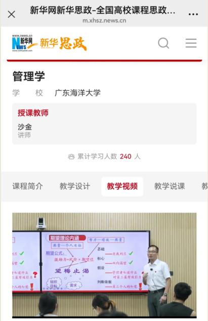 近日,机械工程学院工业工程专业教师沙金负责的《管理学原理与方法》课程授课视频被新华网收录并发布,作为优质教学资源向全社会推广。