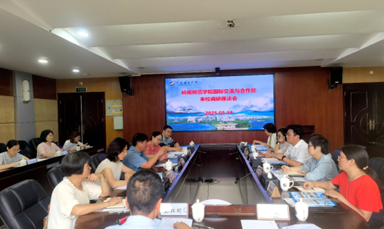 5月14日上午,岭南师范学院国际交流与合作处处长郑志军一行5人来校调研交流。学校党委常委、副校长邓逢光会见了郑志军一行。双方在湖光校区行政四楼会议室举行座谈会,会议由国际交流合作部部长陈进军主持,相关人员参加座谈会。