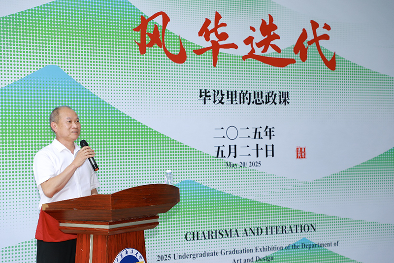5月20日下午,中歌艺术学院艺术设计系2025届本科生毕业作品展在西区大学生活动中心开幕。本次展览以“风华迭代”为主题,集中展示了视觉传达设计、环境设计、产品设计、美术学四个专业194位毕业生的优秀作品,为观众呈现了一场传统与现代交融的艺术盛宴。展览开幕式由中歌艺术学院副院长罗小燕主持,学校党委常委、副校长邓逢光出席开幕式并讲话,学校教务部部长严谨、中歌艺术学院班子成员、湛江市大象空间装饰设计工程有限公司总经理陈土池等校友代表及艺术设计系师生代表参加开幕式。