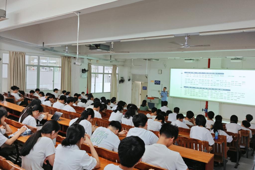 为切实增强师生防诈骗意识,筑牢校园安全防线,5月21日下午,电子与信息工程学院举办了一场主题为“筑牢网络安全防线 做数字时代理性公民”的防范电信网络诈骗与网络安全专题教育活动。湛江市打击治理电信网络新型违法犯罪中心、刑警支队五大队大队长曹伟受邀到明德楼B5202教室,为学院师生带来一场干货满满的防诈骗知识专题讲座。学院党委书记袁仁广、党委副书记王梓珊,以及辅导员、班主任代表、入党积极分子、第八期青马学员、2024级班级安全委员等230余人参与活动。