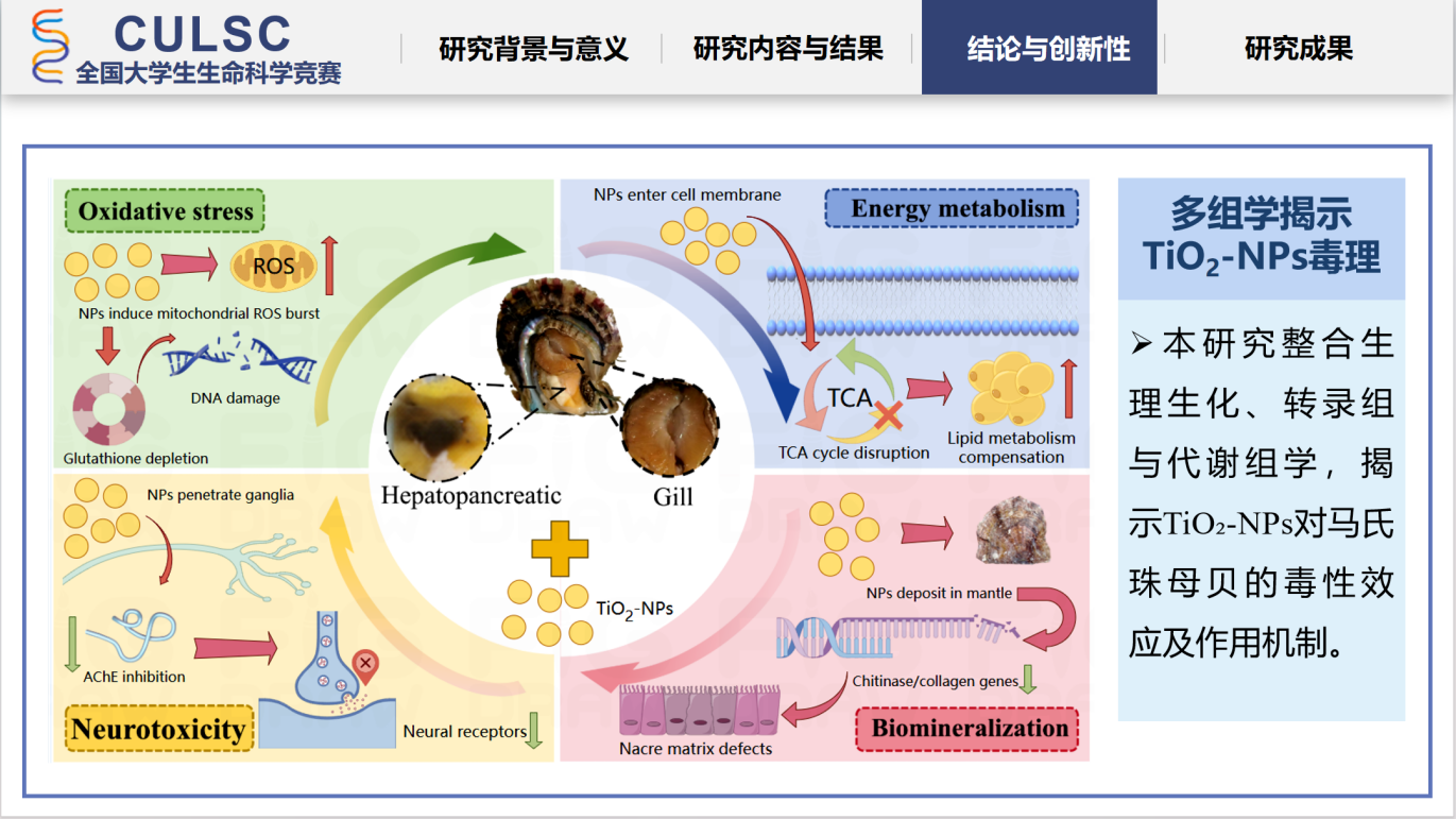 本届竞赛自2025年1月启动,历经网络评审和全国总决赛两个阶段。由邹鹤麒、刘家恩同学主持的参赛项目《纳米二氧化钛胁迫下马氏珠母贝的多组学响应机制:代谢组与转录组整合分析》(指导老师:杨创业、廖永山)荣获全国一等奖,该项目凭借新颖的创新点、优秀的论文成果和出色的现场汇报与答辩,赢得了评审专家们的高度评价。