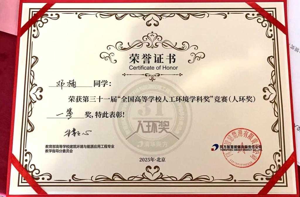 8月29日,第31届“全国高等学校人工环境学科奖”竞赛(简称“人环奖”)颁奖典礼在北京举行。我校海洋工程与能源学院建筑环境与能源应用工程(建环)专业学生再创佳绩,建环专业建能1222班邓楠同学代表学校参赛并脱颖而出,荣获全国一等奖。
