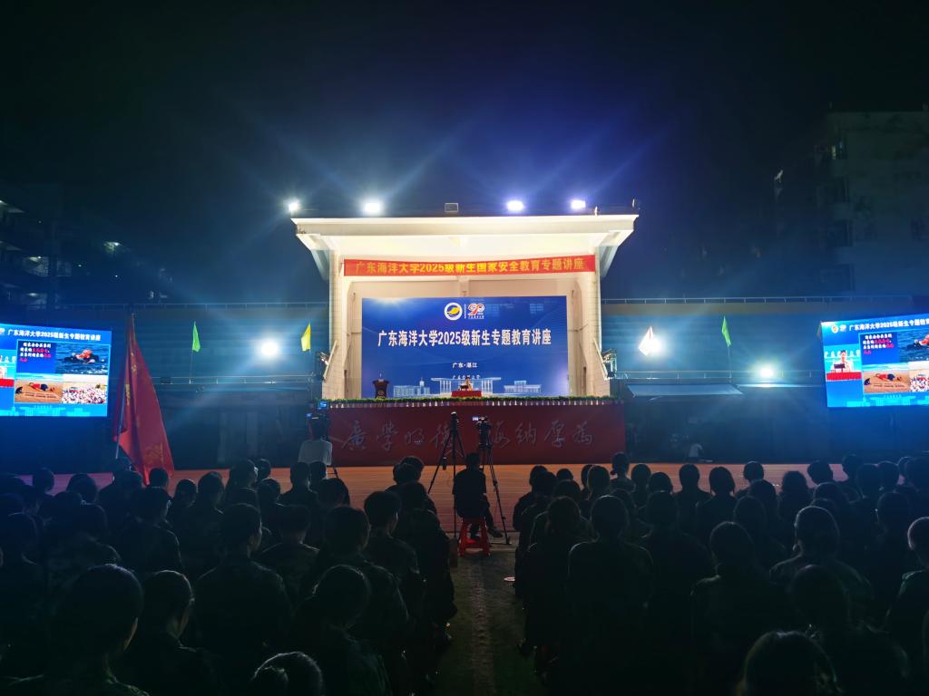 为提高师生国家安全意识,9月18日晚,学校在湖光校区东区运动场举办2025级新生国家安全教育专题讲座。湛江市国家安全和人民防线建设工作小组相关负责人受邀主讲。学校党委宣传统战部、学生工作部、保卫部(武装部)、校团委、现代教育技术中心等相关部门负责人,军训教官、指导员以及湖光校区2025级全体新生现场参加。讲座采用线上线下相结合的方式同步进行,阳江校区、海滨校区、霞山校区2025级新生通过企业微信直播收看。讲座由保卫部(武装部)副部长乔明海主持。