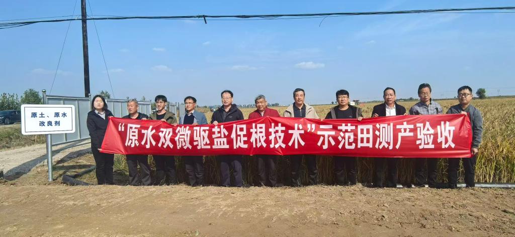 山东省作物学会组织中国农业大学、扬州大学、山东省农业科学研究院等单位专家对《盐碱地综合利用与改良技术研究与示范项目》中的“盐碱地原水双微驱盐促根技术”水稻丰产方进行现场测产验收。专家组在听取项目负责人工作汇报后,实地考察了示范现场,按照农业农村部高产创建田间实打测产验收的程序规定,实地丈量、清仓查验、计量器具校正、水分测定及称重计算,丰产方实收面积1.24亩,鲜谷重678.1公斤,含水量24.6%,按标准含水量13.5%折合亩产476.68公斤。常规原水滴灌(未施土壤改良剂)对照田实收面积1.07亩,鲜谷重265.03公斤,含水量30.1%,折合亩产200.16公斤。技术田亩产较对照田增产276.52公斤,增幅达138%。