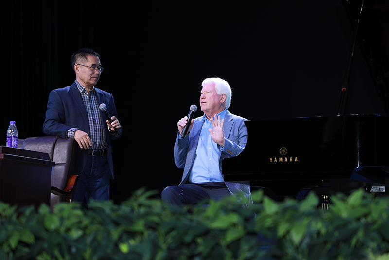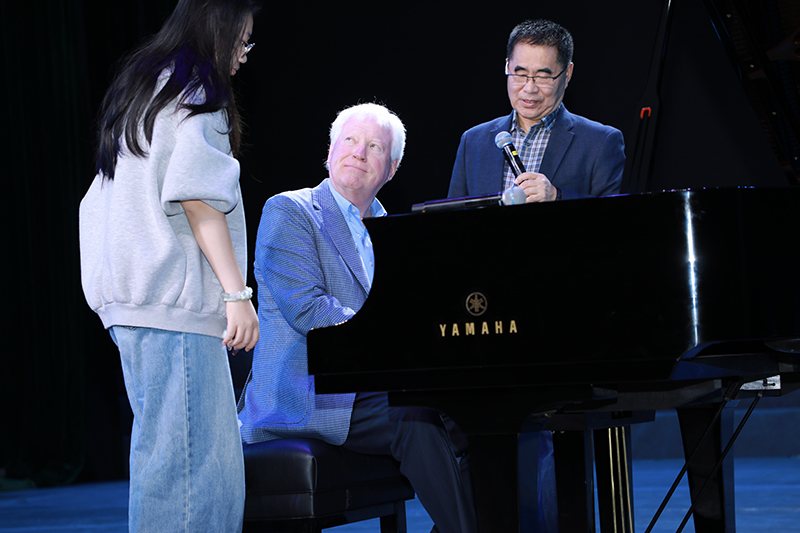 专题讲座中,约翰·塞尔文教授以“巴赫与爵士”为主题,结合自身演奏经历详细解析了不同风格音乐作品的处理技巧,强调“音乐没有边界,重要的是用真诚的情感传递作品内涵”。他通过幽默的讲述和多次示范以及我校学生的积极参与,让在场的听众了解了爵士乐的基础知识和即兴演奏的创意和演奏方式、方法,让大家深深地沉浸在黑白琴键交织和古典与爵士乐轮回的旋律中。在互动环节,听众踊跃提问,从“如何平衡古典演奏的规范性与爵士的即兴性”到“新手钢琴学习的进阶方法”,他都耐心解答并现场示范演奏技巧,让大家受益匪浅。
