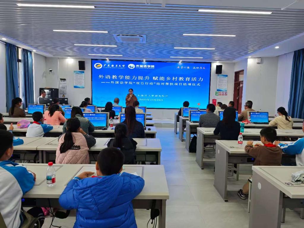 为积极响应国家推动教育均衡发展、强化乡村教师队伍建设的方针政策,10月28日,外国语学院在湖光校区举办“双百行动”结对帮扶活动暨项目结项仪式。“双百行动”结对帮扶项目精准对接徐闻县角尾乡中小学教师的专业发展需求,通过专题培训与成果固化,着力提升乡村英语教育质量,为教育赋能乡村振兴贡献高校力量。徐闻县角尾乡中小学40多名师生参加活动。