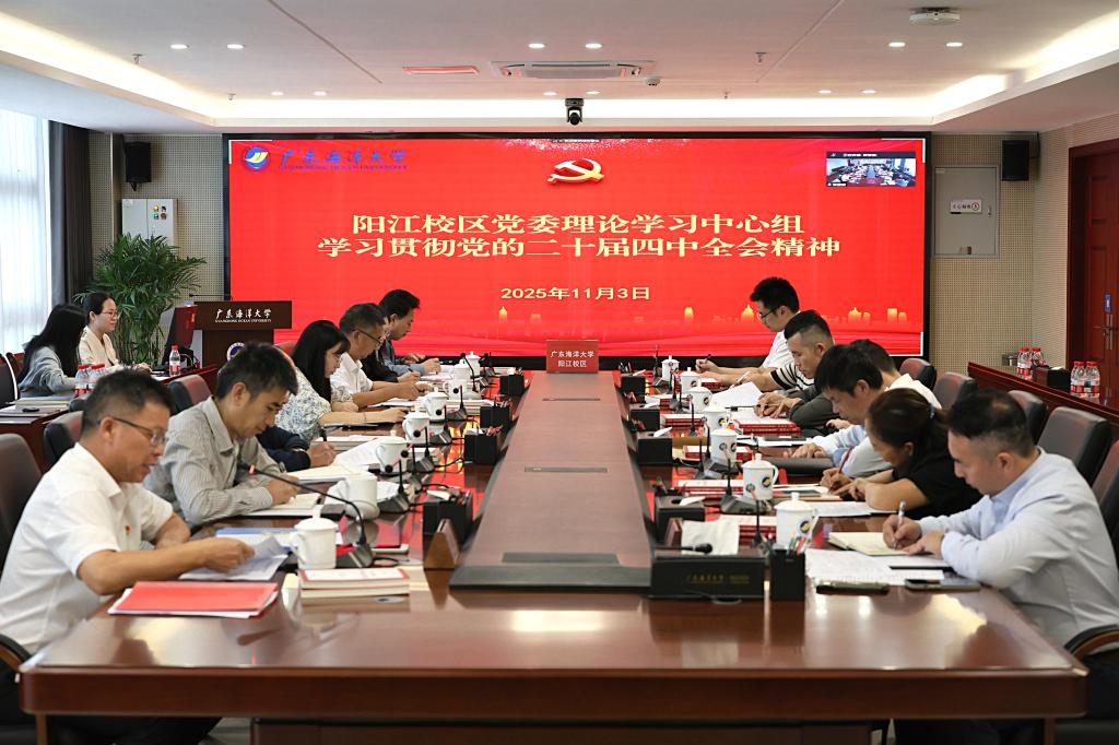 11月3日下午,阳江校区党委理论学习中心组在海纳楼712会议室开展集中学习,认真传达学习习近平总书记在党的二十届四中全会上的重要讲话和全会精神,以及全省、学校传达学习贯彻党的二十届四中全会精神干部大会精神。学校党委常委、副校长、阳江校区党委书记周昌仕主持会议并讲话。校区党委副书记丁永成传达学习贯彻有关会议精神。校区党委理论学习中心组成员参会,各学院党委书记、各部门负责人列席会议。