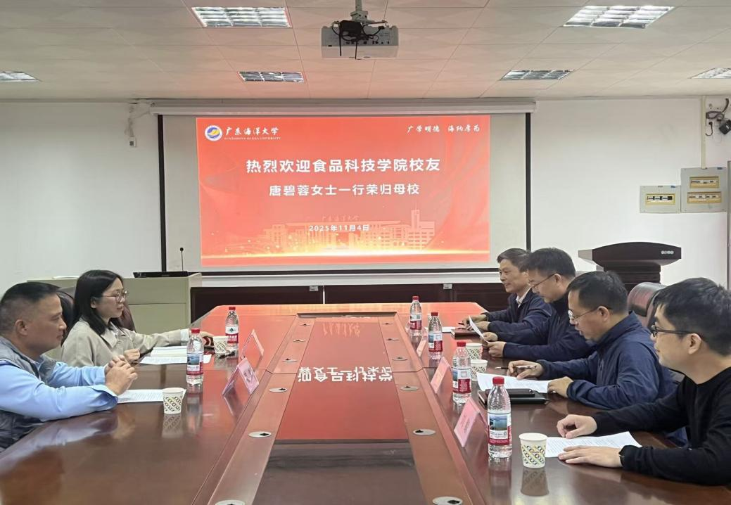 11月4日上午,食品科技学院优秀校友唐碧蓉女士一行荣归母校。校友座谈会暨广东海洋大学“九秩未来奖学金”实施细则洽谈会在望海楼A105会议室举行。学院党委书记伍彬、院长刘书成、党委副书记罗智勇及辅导员代表参加了会议。会议由罗智勇主持。