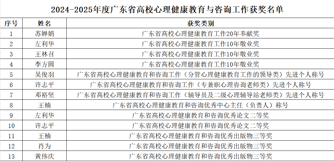 经过组委会专家严格评选,我校荣获多项荣誉。在集体荣誉方面,我校心理健康教育与咨询中心被授予“2024-2025年度广东省高校心理健康教育与咨询工作先进集体”荣誉称号。在个人荣誉方面,我校教师获得“广东省高校心理健康教育工作20年奉献奖”1项,“广东省高校心理健康教育工作10年敬业奖”3项,“广东省高校心理健康教育和咨询优秀中心主任(负责人)称号”1项,“广东省高校心理健康教育和咨询工作先进个人称号”3项,优秀论文、出版物5项。