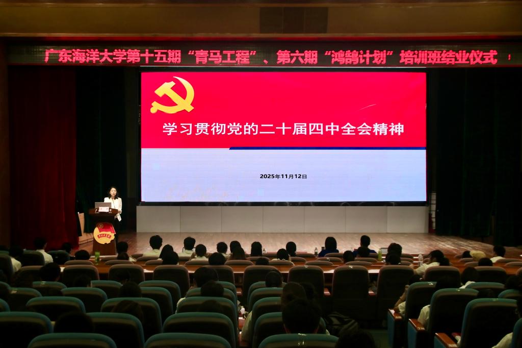 11月12日下午,我校第十五期“青马工程”暨第六期“鸿鹄计划”培训班结业仪式在湖光校区举行。学校党委副书记谭平出席仪式并作党的二十届四中全会精神专题宣讲。校团委书记袁路主持活动,校团委老师、培训班全体学员、学院“青马工程”学员代表等500余人参加活动。