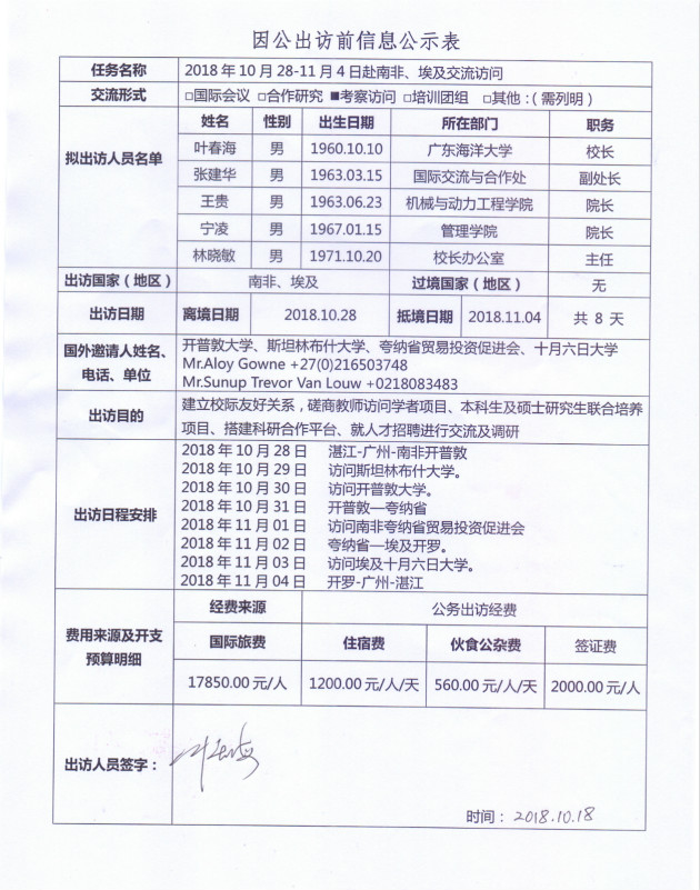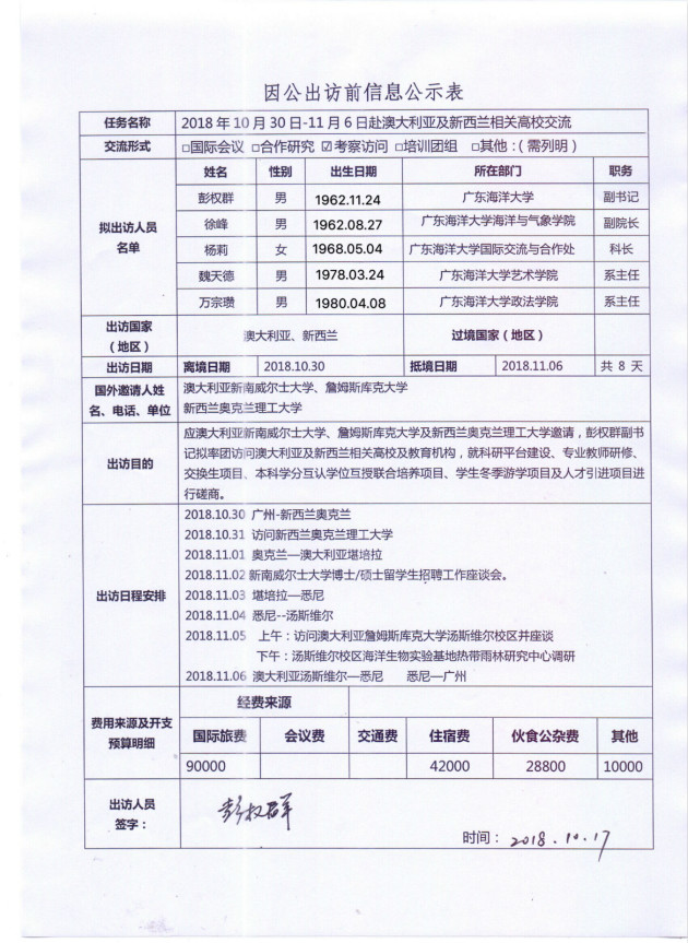 根据《关于进一步规范省部级以下国家工作人员因公临时出国的意见》的要求,现将广东海洋大学因公出访信息予以公示。公示时间为2018年10月18日至23日。如有意见,请在公示期内,向相关单位反映。(国际交流与合作处电话:0759-2396206;纪委办电话:0759-2383501)
