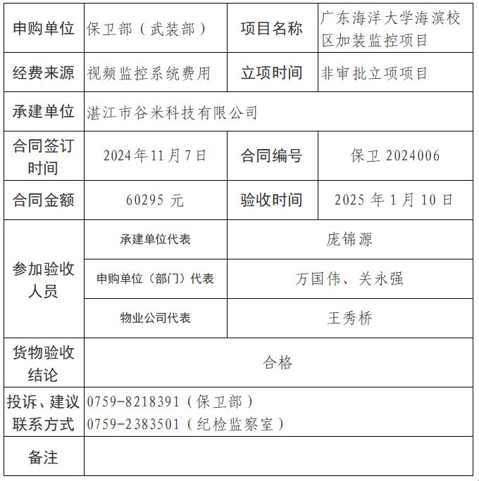 保卫部(武装部)海滨校区加装监控项目已验收,现将验收结果公示,公示时间:2025年3月17日至3月19日。