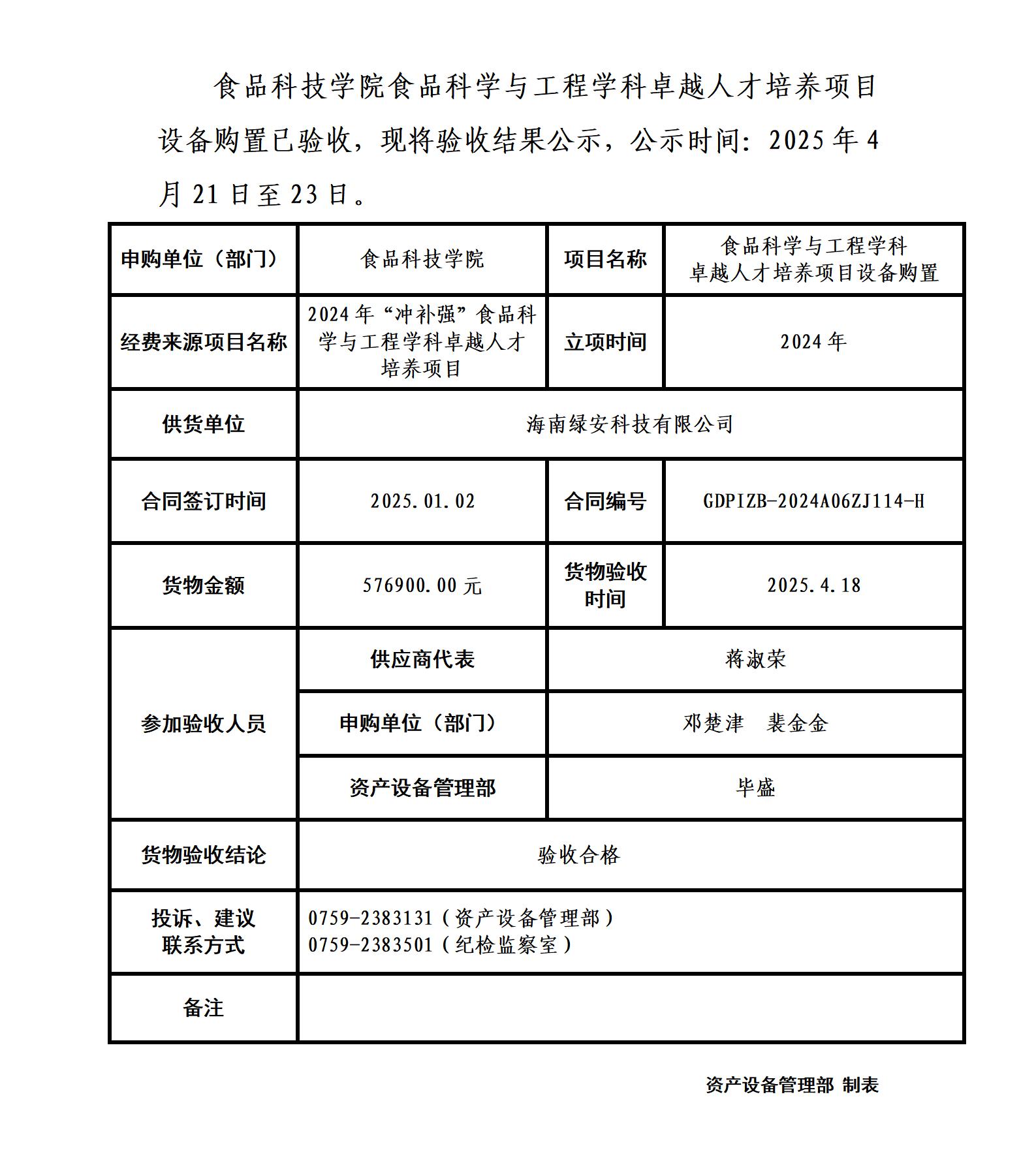 食品科技学院食品科学与工程学科卓越人才培养项目设备购置验收公示
