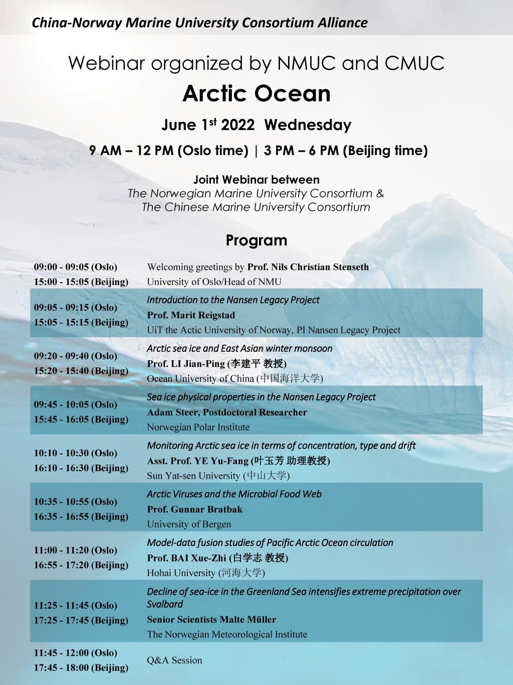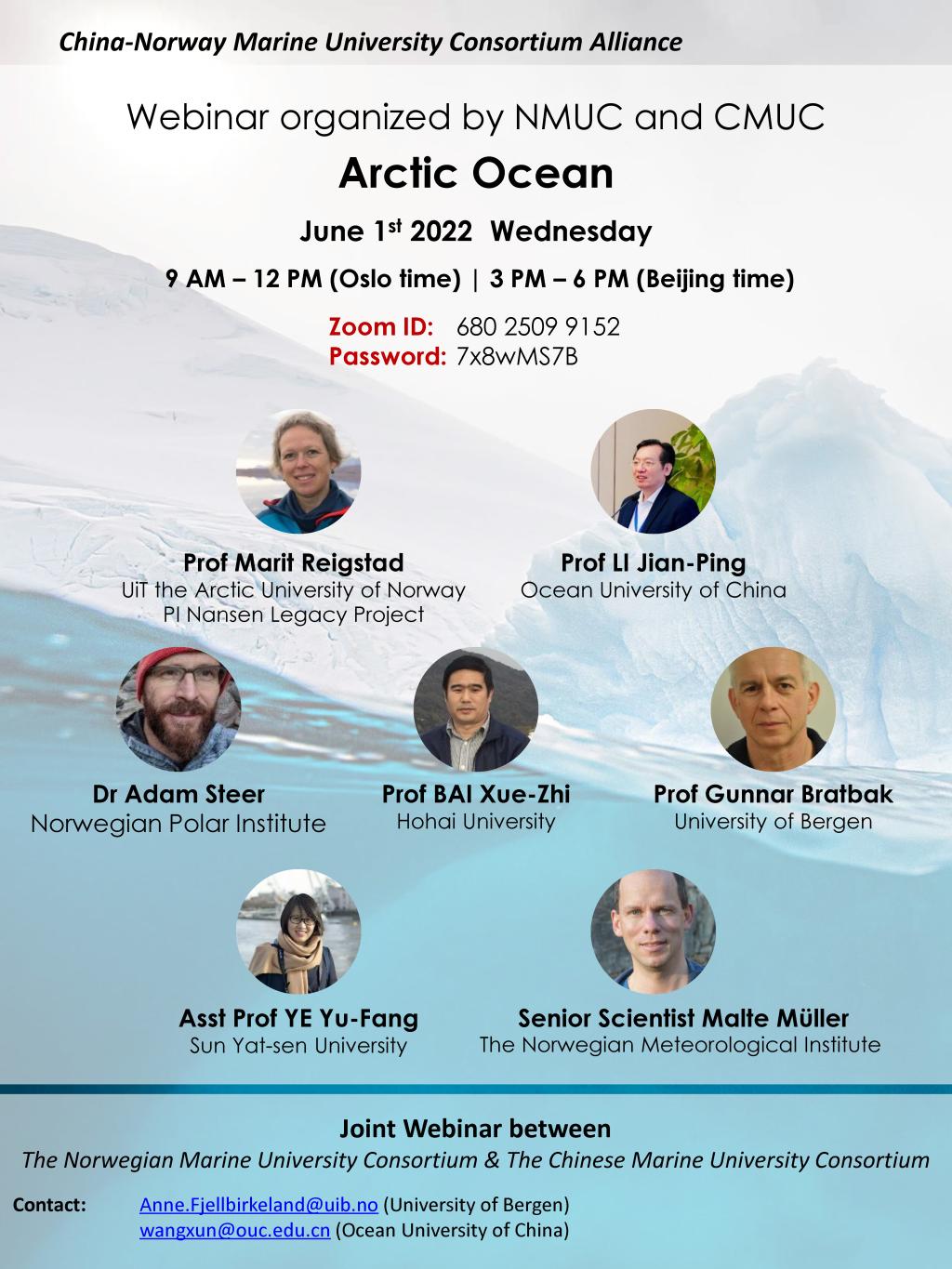 中挪海洋大学联盟将于北京时间6月1日15:00-18:00举办第一次主题线上研讨会: Arctic Ocean,欢迎各位老师踊跃参加!