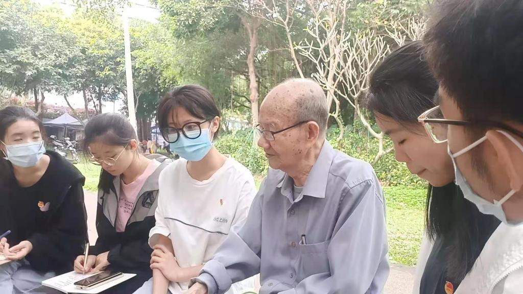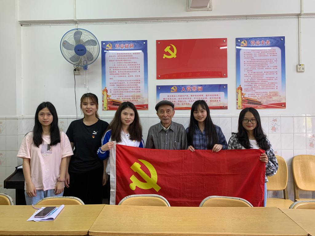 20日,学生代表分为三个小组,走街串巷、进村入户寻访老党员、老战士、老模范。在海滨公园,同学们采访了93岁高龄的罗国华老同志,罗老先生是跟随着党从抗日战争和解放战争胜利走过来的老战士,1941年便加入了中国共产党,从此将自己的一生都奉献了给党,退休后坚持给广大青年学子讲述党史和革命史。在此次采访中,罗老先生给同学们上了一堂生动详实的党课,他勉励同学们要继承和发扬党领导革命的优良传统与作风,好好学习文化知识,认真深入学习党史,争取早日成为国家的栋梁,即使不能成为国家的栋梁,也要尽力为国家做贡献。在赤坎军休所活动中心,同学们如约见到了田欣民老党员。田老先生原是空军二师副参谋长,飞行时长达29年,1991年退伍,曾被中组部评为全国离退休干部先进个人。在访谈中,田老先生回顾了自己作为一名光荣的人民空军的飞行生涯,教育引导同学们时刻要以一颗赤子之心、忠于祖国、忠于党,践行党为人民服务的初心和使命,有一份心出一份力,遇事要沉着冷静,善于依据平时的经验和学到的知识积极应对。在黎耀老党员的家里,同学们受到了热情的接待。黎老先生家乡是革命老区,从小就受中国共产党领导革命的影响,青少年时期便跟随当地的地下党组织参加革命,刚满18周年就入党了,至今已有50年党龄。在访谈中,黎老先生讲述了其从小就参加革命的故事、入党前后的思想变化,以及工作期间和退休后的难忘经历,希望同学们要始终坚定信念,爱国爱党,学好本领,为社会、为人民贡献一份力量。