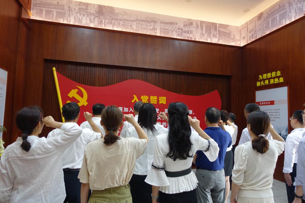 在黄学增纪念亭内,黄学增烈士铜像立于中间,墙壁上撰写着黄学增生平简介,全体人员在瞻仰革命烈士的英雄风采后,向黄学增烈士雕像三鞠躬,表达对先烈深切缅怀和崇高敬意。在学院党委书记肖文辉的带领下,全体党员面向党旗,庄严宣誓,重温了入党誓词。