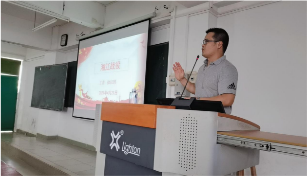 徐以国老师为大家讲述了红军长征以来关乎中央红军生死存亡的最壮烈的关键一战——湘江战役。他对湘江战役的历史背景、战争过程及其影响进行了讲解,其中重点谈到了红军师长陈树湘不愿当俘虏、自甘断肠明志的英勇事迹,用坚定的理想信念诠释了中国共产党人的初心和使命。他还播放了相关影像资料,使大家感受革命先烈对党、对革命事业的无限忠诚以及勇于突破、敢于纠正错误的自我革命勇气。