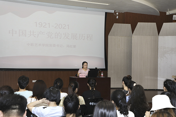 4月25日下午,中歌艺术学院党委书记冯红爱在舞蹈楼206室讲授”思政第一课”—《中国共产党的发展历程》,学院学生党员、发展对象和入党积极分子等110余人参加。