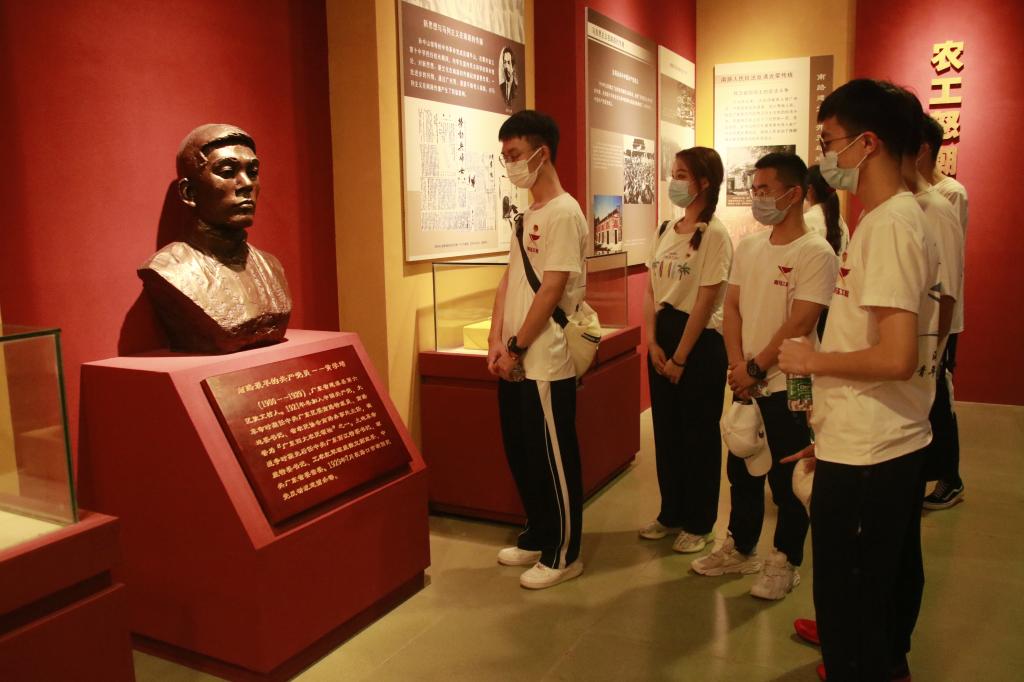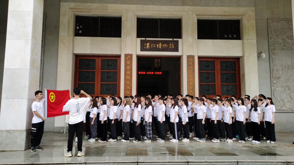 在博物馆内,一行先后参观了“粤桂边区革命斗争史展览”“湛江人民抗法斗争陈列”和“从广州湾到湛江――湛江开埠百年历史展览”等7个主题展厅,全方位了解了国民革命、抗日战争以及解放战争时期,南路以至粤桂边区人民革命斗争腥风血雨的烽火历程、革命烈士不怕牺牲英勇搏斗的历史故事。面对一张张珍贵照片、一件件文献实物,师生们认真端详,驻足细读,相互交流,了解背后故事,追寻历史记忆,领悟先烈精神。在博物馆外,学生代表黄鹏辉带领全体团员重温入团誓词,面对鲜红的团期,大家举起右手、握紧拳头,庄严宣誓。
