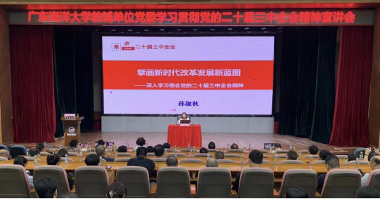 10月16日下午,教辅单位党委在湖光校区多功能厅举行学习贯彻党的二十届三中全会精神宣讲报告会,学校党委理论宣讲团成员、马克思主义学院副院长孙淑秋作了题为《擘画新时代改革发展新蓝图》的专题辅导报告,教辅单位党委书记陈清毫主持报告会,教辅单位全体职工参加。