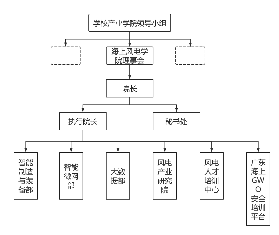 学院合作双方分别为:甲方是广东海洋大学;乙方是海上风电产业相关的企业,包括北京优利康达科技股份有限公司、明阳智慧能源集团股份公司、广东金风科技有限公司、广东鉴衡海上风电检测认证中心有限公司、广东史特牢紧扣系统有限公司、阳江市中乌巴顿技术研究院、广东龙马重工集团有限公司等。甲方的机械与能源学院、材料科学与工程学院、计算机科学与工程学院、商学院等相关专业纳入学院。学院管理模式上采用理事会机制,在学校产业学院领导小组的领导下开展产业学院的各项工作。学院设立理事会,实行理事会领导下的院长负责制。设1名院长、2名执行副院长,秘书处设在广东海洋大学机械与能源工程学院。学院下设三部一院一中心,三部是智能制造与装备部、智能微网部、大数据部,一院是风电产业研究院,一中心是风电人才培训中心。