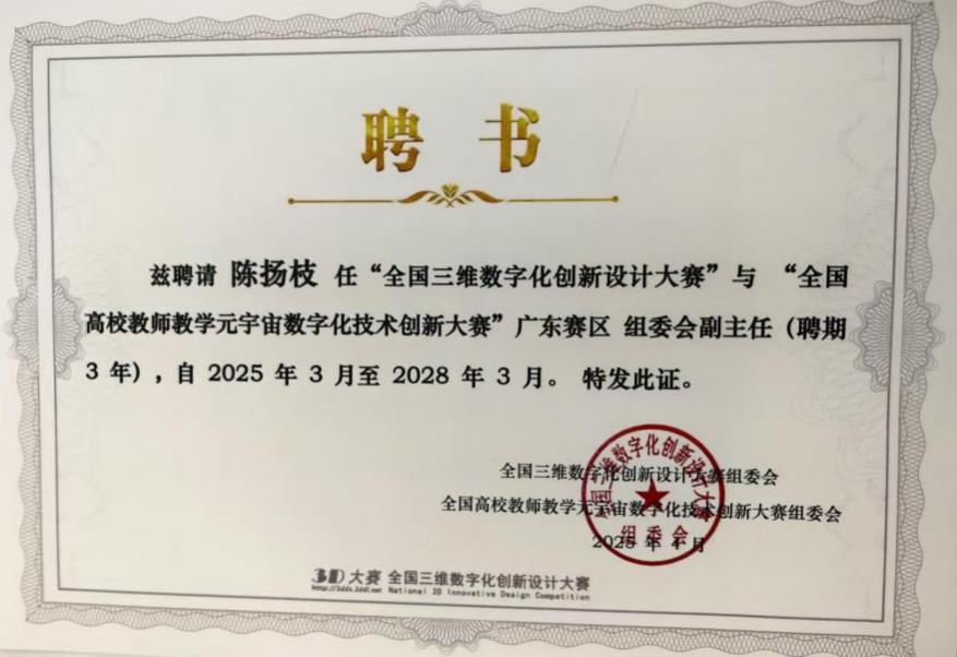 近日,广东海洋大学机械与能源工程学院院长陈扬枝教授正式受聘为“全国三维数字化创新设计大赛”与“全国高校教师教学元宇宙数字化技术创新大赛”广东赛区组委会副主任委员,这标志着学院在推动数字化创新教育、深化产教融合领域迈出重要一步。