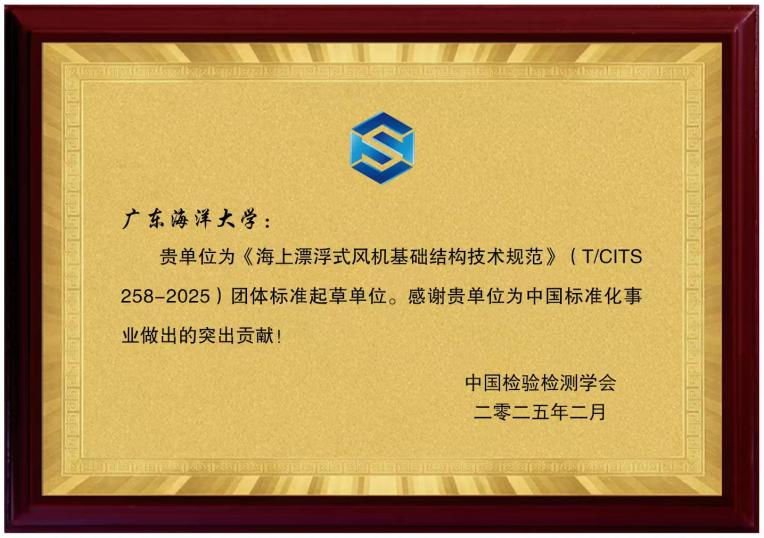 近日,由广东海洋大学海上风电产业学院联合国内多家知名企业、科研院所和高校共同参与制定的《海上漂浮式风机基础结构技术规范》(T/CITS258-2025)团体标准,已于2025年2月19日正式发布,标志着我校在海上风电领域标准制定工作中实现“零的突破”,为我国漂浮式风电产业规范化发展注入新动能。