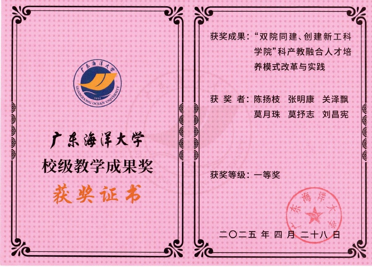 根据《关于开展2024年校级教学成果奖评选工作的通知》(校教务〔2024〕103号),经个人(团队)申报、单位(部门)推荐、职能部门资格审查、专家评审、学校教学指导委员会审议,我院陈扬枝、张明康等人申报的成果——《“双院同建、创建新工科学院”科产教融合人才培养模式改革与实践》获得广东海洋大学教学成果奖一等奖,该项奖励是学校对我院四年来办学成果的高度认可。