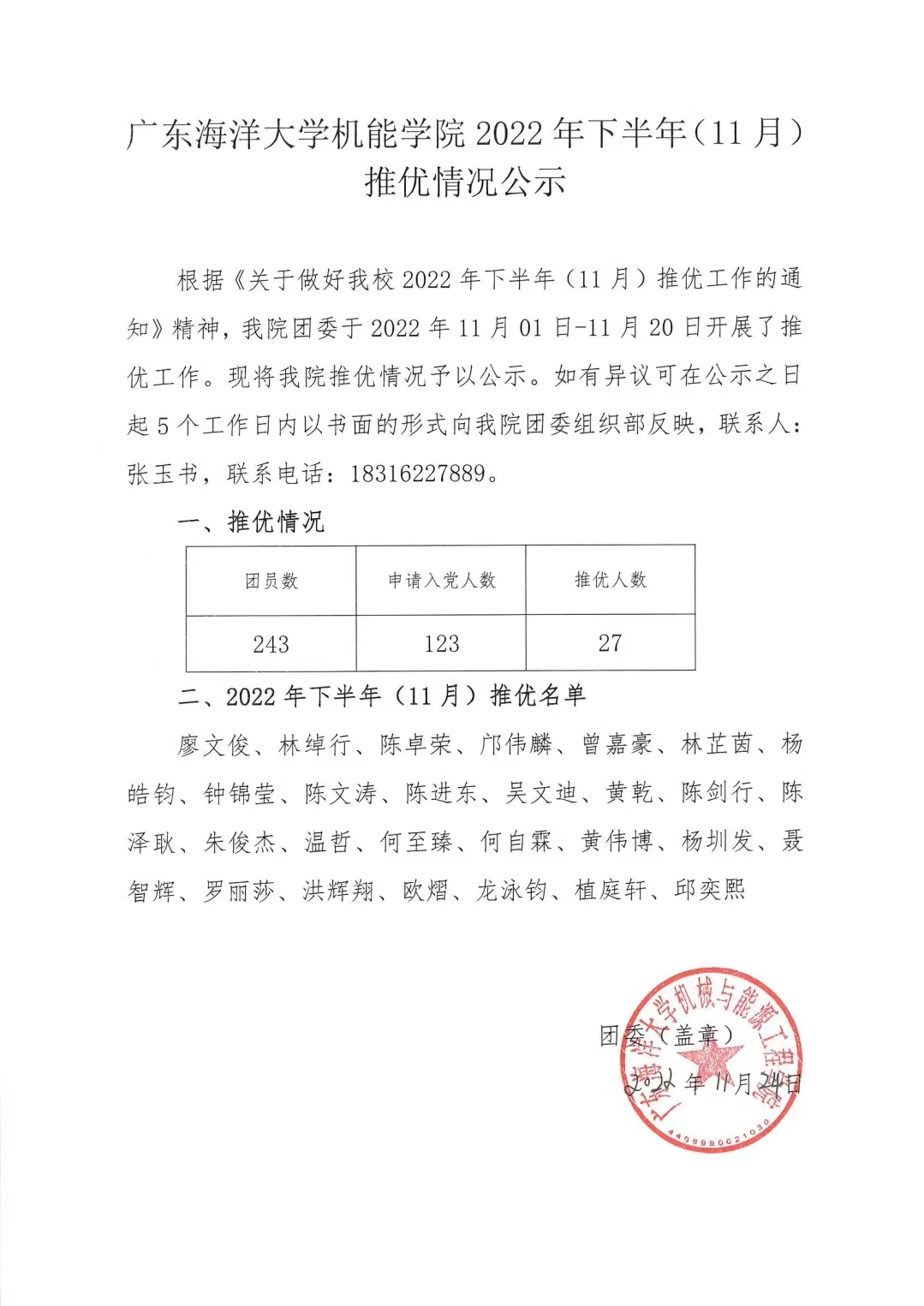 广东海洋大学机械与能源工程学院2022年下半年(11月)推优情况公示