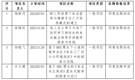 根据《广东海洋大学教育教学改革项目管理办法》(校教务〔2020〕28号)和《关于做好2024年度校级教育教学改革项目结题验收工作的通知》的相关规定,食品科学与工程学院组织开展了2024年度校级教育教学改革项目结题验收工作。学院共收到3份项目结题验收材料和1份项目延期申请材料,随后组织专家评审通过,并经学院党政联席会议审定通过,现将食品科学与工程学院2024年度校级教育教学改革项目结题验收结果予以公示。具体如下: