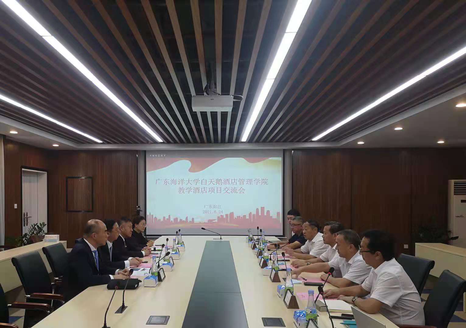 2021年8月24日下午,广东海洋大学白天鹅酒店管理学院教学酒店项目交流会在阳江校区海行楼5楼会议室举行。校长潘新祥,校党委常委、副校长、阳江校区党委书记、管理委员会主任宁凌,学校人事处处长、阳江校区党委副书记、管理委员会常务副主任洪鹏志,商学院负责人李力、唐志军和广州白天鹅酒店集团总经理张添,副总经理刘斌,行政部总监陈曦、白天鹅培训学校副校长陈晞等参加了交流会。