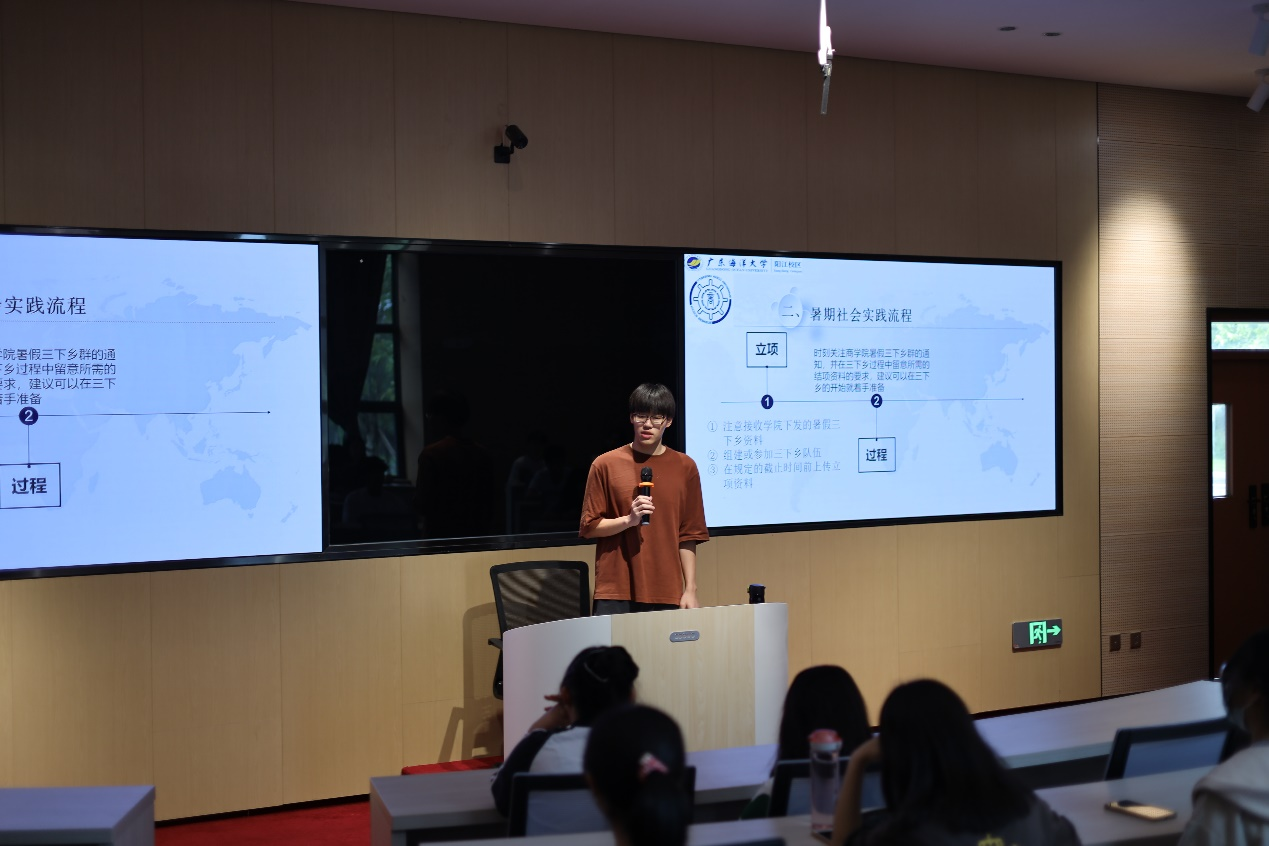 首先,商学院社会实践部代表邓伟睿对过去一年的社会实践活动进行总结。接着,由寒假寒招活动的优秀个人代表陈幸分享她的寒招经历。随后,邓伟睿介绍了“三下乡”社会实践活动的内容以及基本流程。最后,与会人员观看往期优秀团队制作的视频以加深对“三下乡”实践活动的了解。