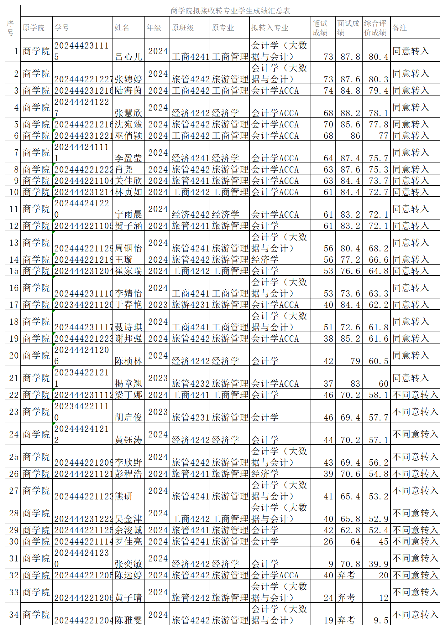 根据《广东海洋大学全日制本科学生转专业管理规定》(校教务〔2019〕60号)、《关于做好2025年度转专业工作的通知》 ,以及《商学院2025年本科学生转专业遴选实施细则》的精神和要求,经商学院转专业工作委员会对申请转入商学院的学生转专业理由、学业成绩、思想道德表现和面试成绩等进行综合评价、排序,现确定拟接受转专业学生名单。