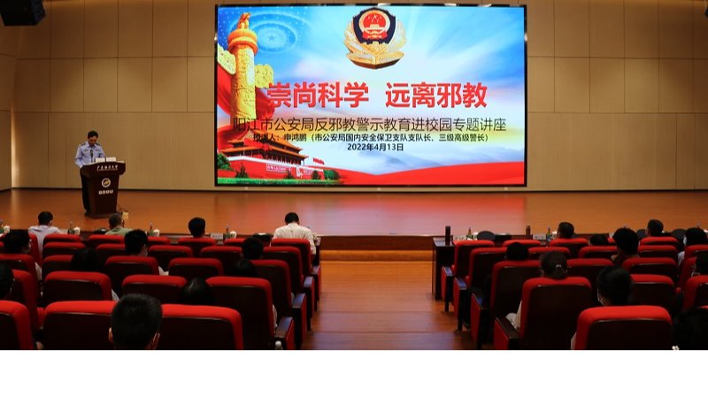 4月13日下午,校区联合阳江市公安局在校园开展“4·15”国家安全日普法宣传暨反邪教知识宣传活动,深入学习贯彻习近平法治思想,提高校区师生的国家安全法治意识和反邪教意识,树牢总体国家安全观,感悟新时代国家安全成就,为迎接党的二十大胜利召开营造良好氛围。活动首先邀请了阳江市公安局国内安全保卫支队支队长、三级高级警长申鸿鹏在海纳楼113报告厅作主题为“崇尚科学、远离邪教”的反邪教警示教育进校园专题讲座。讲座...