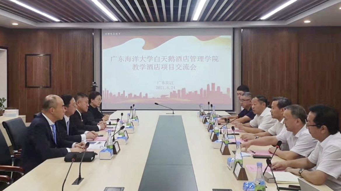2021年8月24日下午,广东海洋大学白天鹅酒店管理学院教学酒店项目交流会在阳江校区海行楼5楼会议室举行。校长潘新祥,校党委常委、副校长、阳江校区党委书记、管理委员会主任宁凌,学校人事处处长、阳江校区党委副书记、管理委员会常务副主任洪鹏志,商学院负责人李力、唐志军和广州白天鹅酒店集团总经理张添,副总经理刘斌,行政部总监陈曦、白天鹅培训学校副校长陈晞等参加了交流会。会上,洪鹏志首先介绍了阳江校区的建设背...